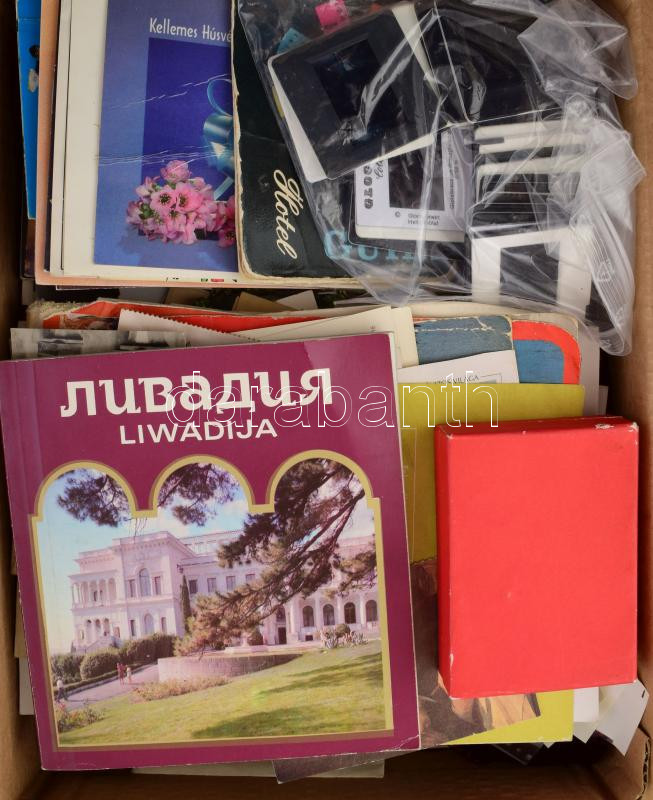 Közepes doboznyi vegyes papírrégiség, benne sok képeslap, kb. 300 db fotó, diafilm, kártyanaptár, nyomtatvány, térkép, jelvény, turisztikai kiadvány, stb.