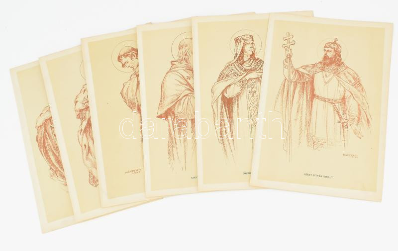 Márton Lajos (1891-1953) grafikáiról készült 6 db reprodukció (uralkodók, szentek), lapméret: 24x16,5 cm