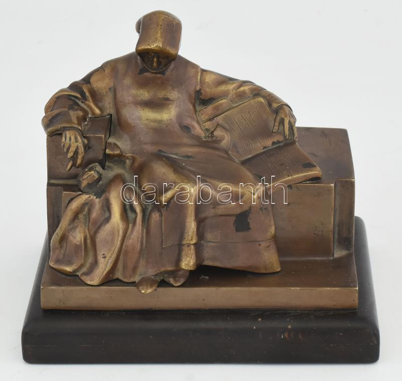 Anonymus. Bronz szobor, a városligeti Anonymus-szobor kicsinyített mása, fa talapzaton. 17x12x14 cm