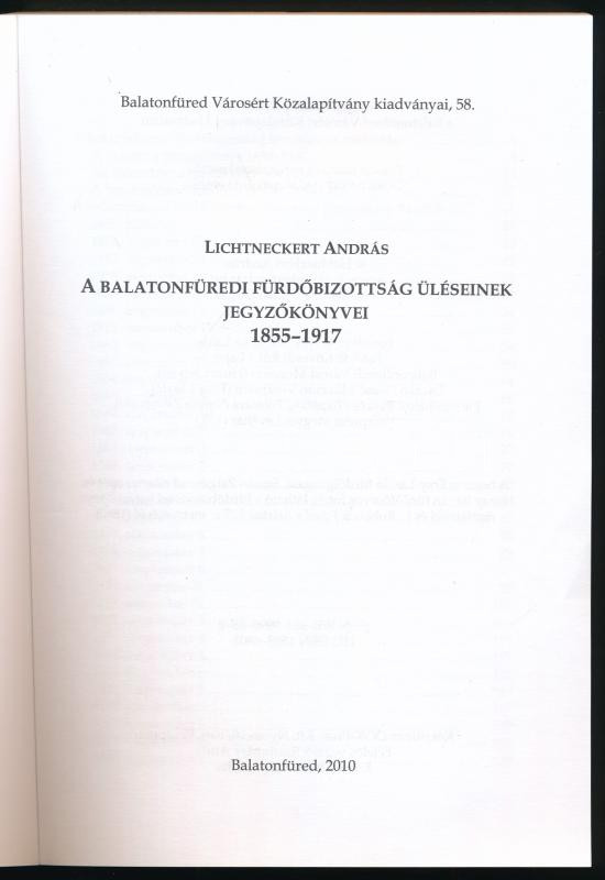 Lichtneckert András: A balatonfüredi fürdőbizottság üléseinek jegyzőkönyvei 1855-1917. Balatonfüred Városért Közalapítvány kiadványai 58. Balatonfüred, 2010, Balatonfüred Városért Közalapítvány. Kiadói papírkötés. Megjelent 400 példányban.