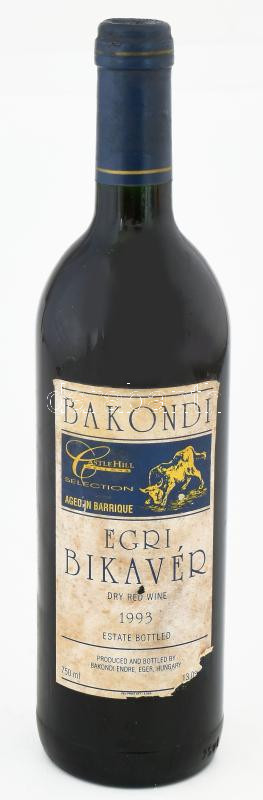 1993 Bakondi Egri Bikavér, száraz vörösbor, 13%, 0,75l, bontatlan, kopott címkével.