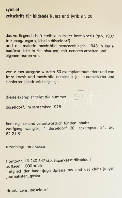 1975 Symbol. Zeitschrift für bildende Kunst und Lyrik Nr. 20. Kocsis Imre, és Mechthild Nemeczek műveivel illusztrált neo-avantgárd folyóirat. Megjelent 1000 példányban. Ez számozott példány (16./50) példány. /