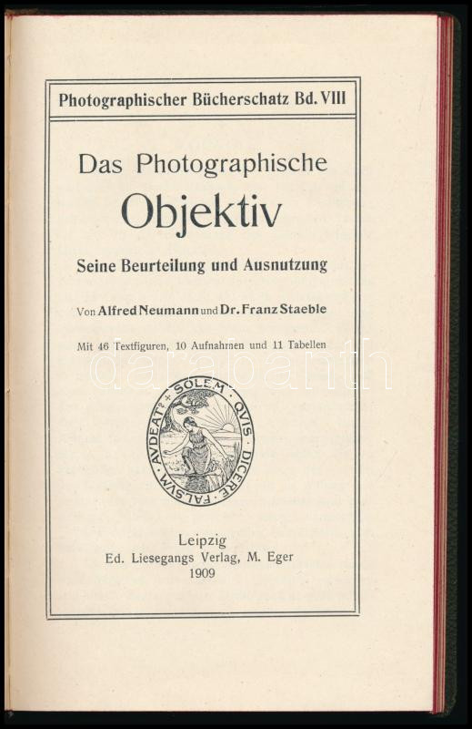 Alfred Neumann - Franz Staeble: Das Photographische Objektiv. Photographischer Bücherschatz Bd. VIII. Mit 46 Textfiguren, 10 Aufhnahmen und 11 Tabelen. leipzig, 1909, Ed. Liesegamgs Verlag M. Eger, 152 p. Német nyelven. Fekete-fehér egészoldalas és szövegközti képanyaggal illusztrált. Korabeli reklámokkal. Kiadói aranyozott egészvászon-kötés, festett lapélekkel, kissé kopott borítóval. Ritka!