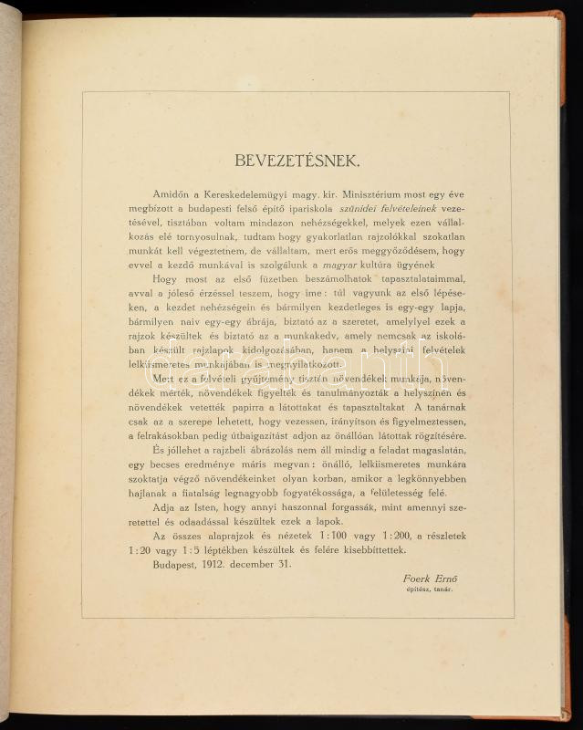 Description: Foerk Ernő: A Magyar Királyi Állami Felső Építő Ipariskola szünidei felvételei. I. füzet. (Bp., 1912, Korvin-Testvérek-ny.), 2 sztl. lev.+ 40 (egészoldalas ábrák) t. Átkötött, modern félbőr-kötésben, jó állapotban, címlap nélkül.