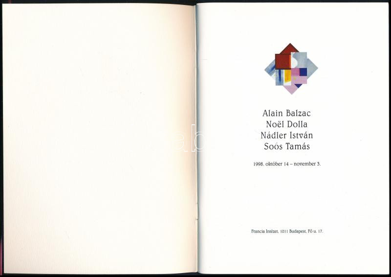 Description: Hegyi Lóránd: Alain Balzac, Noël Dolla, Nádler István, Soós Tamás. Bp., 1998, Francia Intézet. 40 p. Magyar és francia nyelven. Színes képekkel, többek közt Nádler István műveinek reprodukcióival illusztrált kiállítási katalógus. Kiadói papírkötés.