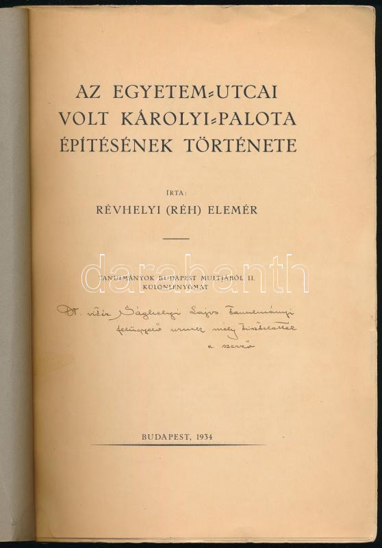 Révhelyi (Réh) Elemér: Az Egyetem-utcai volt Károlyi-Palota építésének története. A szerző, Révhelyi Elemér (1889-1976) művészettörténész által Sághelyi Lajos (1893-1975) tanár, tankönyv- és pedagógiai szakíró részére DEDIKÁLT példány! Tanulmányok Budapest Multjából II. Különlenyomat. Bp., 1934, (Budapest Székesfőváros Házinyomdája-ny.), 20 p.+8 t. Kiadói papírkötés, javított gerinccel, foltos borítóval.