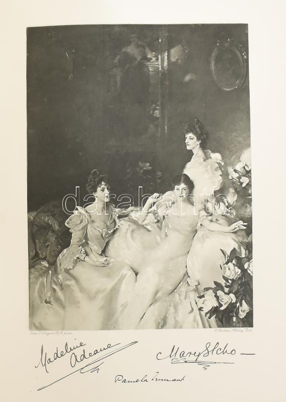 The book of Beauty. (Era King Edward VII.) A collection of beautiful portraits with literary, artistic, and musical contributions by men and women of the day. Edited and arranged by Mrs. F. Harcourt Williamson. New York - London, 1904, Dodd Mead - Hutchinson. (London-Aylesbury, Hazel, Watson and Viney-ny.), XI+214 p. + 12 (színes heliogravűr táblák, az elülső tábla belsejében lévő tokban, egy tábla sarkán kis hiánnyal, 31x24 cm és 27x21 cm közötti méretben, a hátoldalakon a keret mentén folttal) t. Angol nyelven. Nagyon gazdag fekete-fehér heliogravűr egészoldalas, és szövegközti képanyaggal, valamint 12 színes heliogravűr táblával illusztrált, rajta a kor ünnepelt dámáival és hölgyeivel. Egészvászon-kötés, kopott, foltos borítóval, javított kötéssel, 41x34 cm. "This copy is No. 43 of the special Edition de Luxe, which contains twelve duplicate hand-coloured plates, and is limited copies for sale in America." Számozott (43./50), a kiadó által aláírt, dátumozott (22nd. December 1904.) példány.