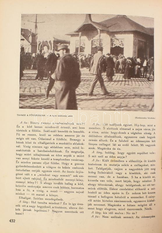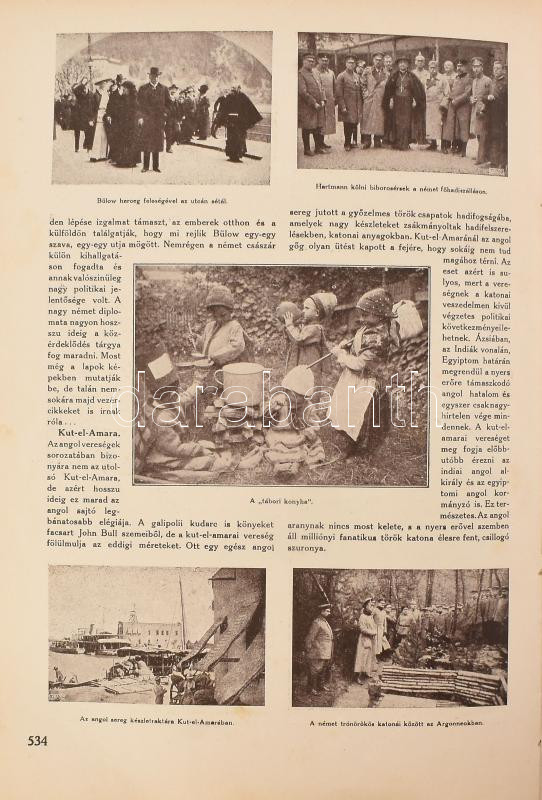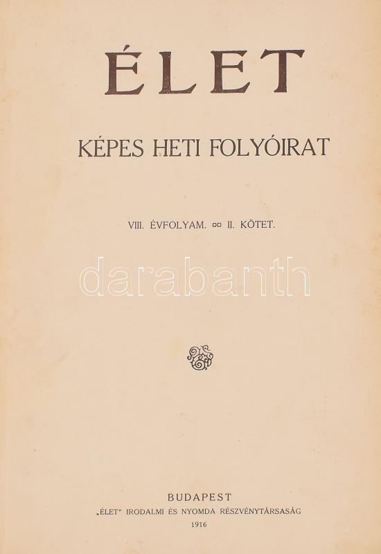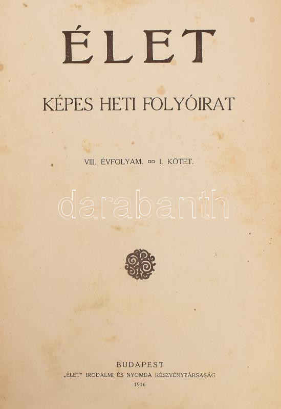 1916 Élet képes heti folyóirat teljes évfolyama, két kötetben: VIII. évf. 1-53. sz., 1916. jan. 2. - dec. 31. Bp., ,,Élet"-ny., 632 p., VI+656 p. Benne számos érdekes, részben a háborúval kapcsolatos írással, képekkel. Félvászon-kötésben, a borítón kis sérülésekkel, helyenként foltos lapokkal.