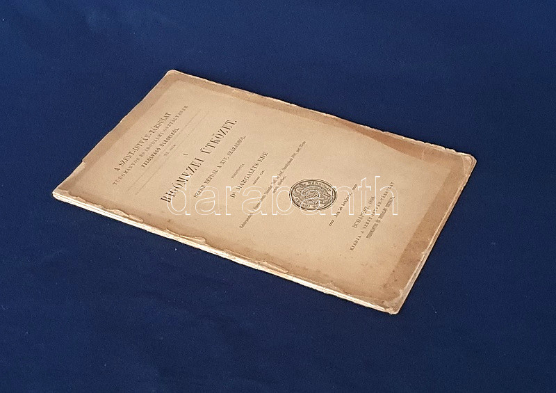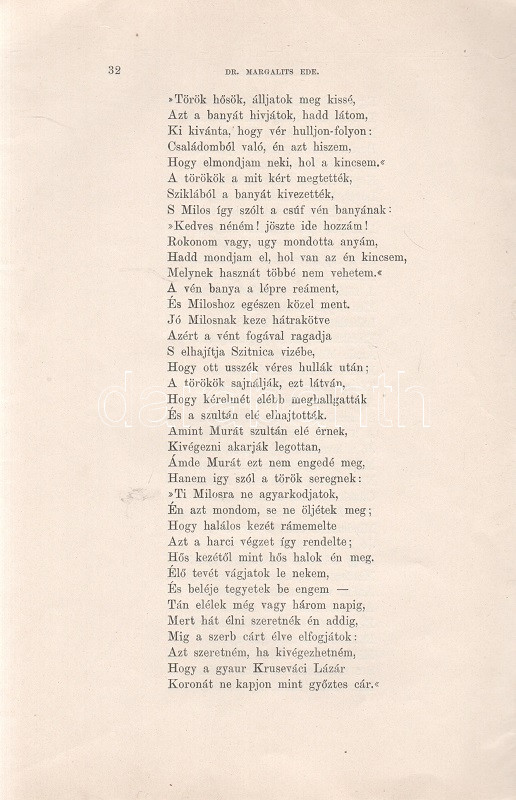 Margalits Ede (1849-1940) szlavista, műfordító, egyetemi tanár szerb népeposz-fordítását a Szent-István-Társulat irodalmi osztályának 1898. november 22-i ülésén olvasta fel. Példányunk fűzése meglazult.