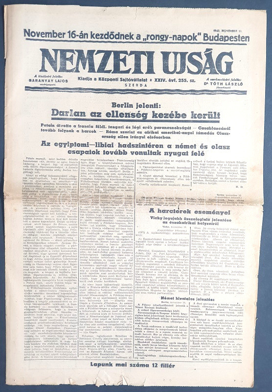[II. Világháború] Nemzeti Ujság. 1942. november 11. (Napilap, XXIV. évfolyam, 255. szám) "November 16-án kezdődnek a rongy-napok Budapesten -- Berlin jelenti: Darlan az ellenség kezébe került -- Petain átvette a francia földi, tnegeri és légi erők parancsnokságát - Casablancánál tovább folynak a harcok - Róma szerint az afrikai amerikai-angol támadás Olaszország ellen irányul elsősorban -- Az egyiptomi-libiai hadszintéren a német és olasz csapatok tovább vonultak nyugat felé." Félbehajtva, jó állapotban.