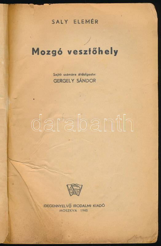 Saly Elemér: Mozgó vesztőhely. Sajtó számára átdolgozta: Gergely Sándo... https://www.darabanth.com/en/475-Online-auction/475.0/Books/Books-History~1000019/Saly-Elemer-Mozgo-vesztohely-Sajto-szamara-atdolgozta-Gergely-Sandor-Moszkva-1945-Ideg~II3226064