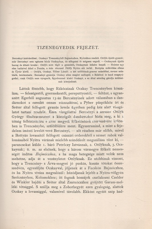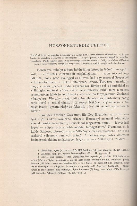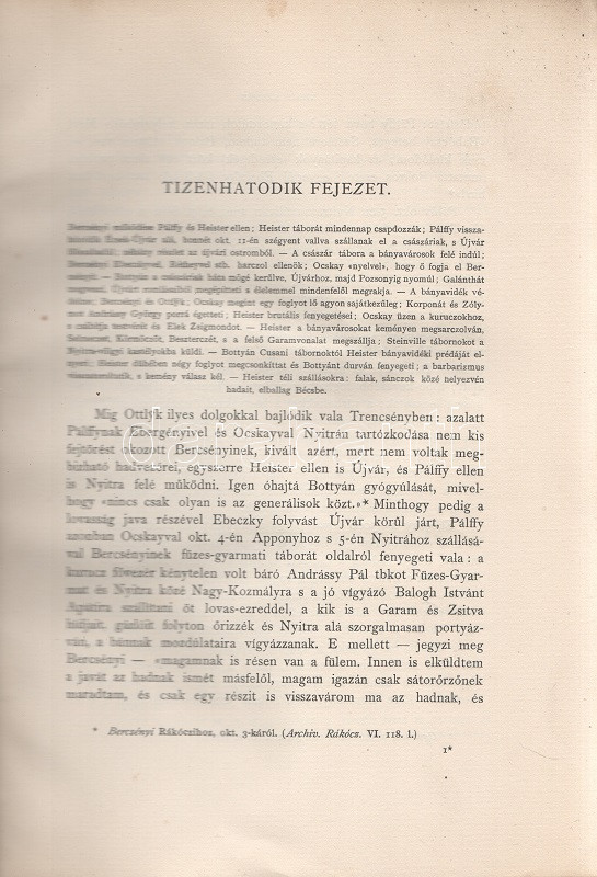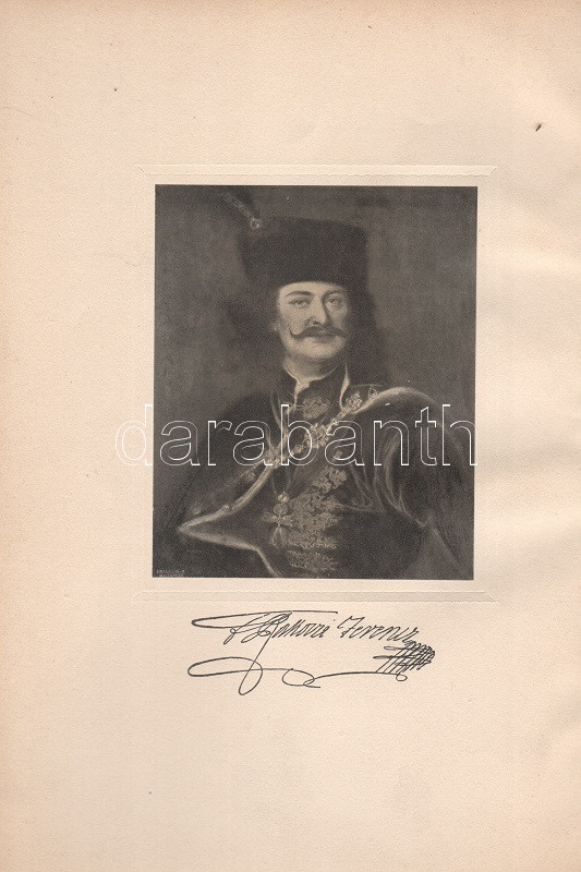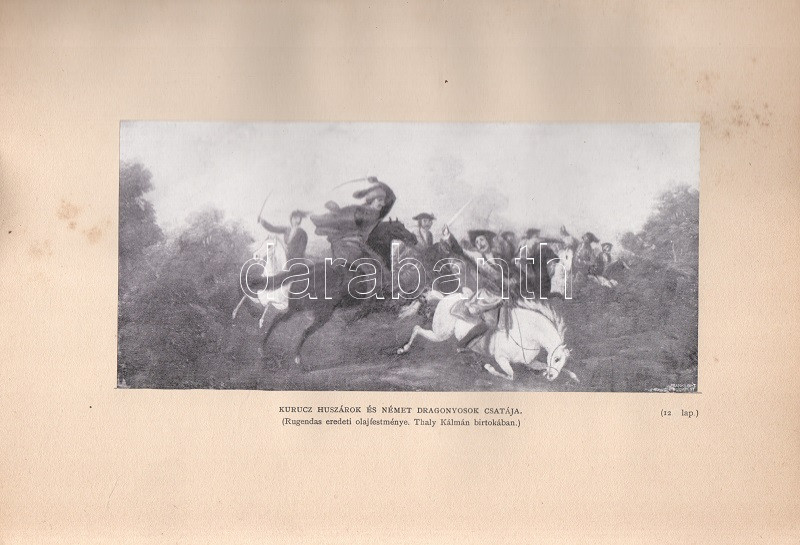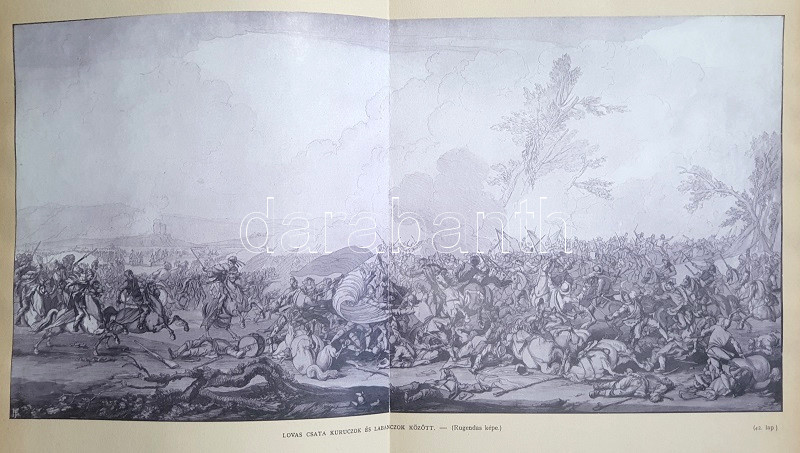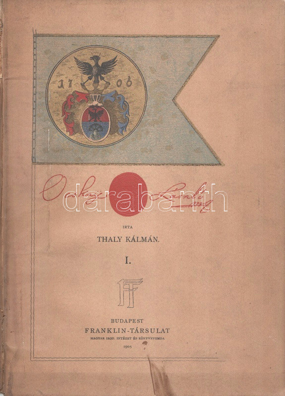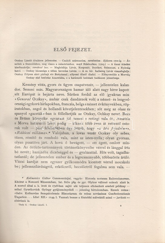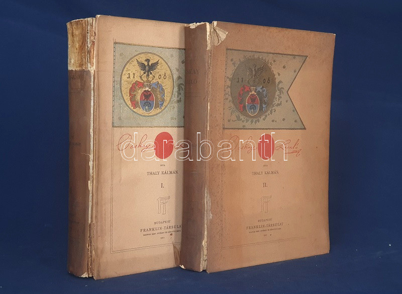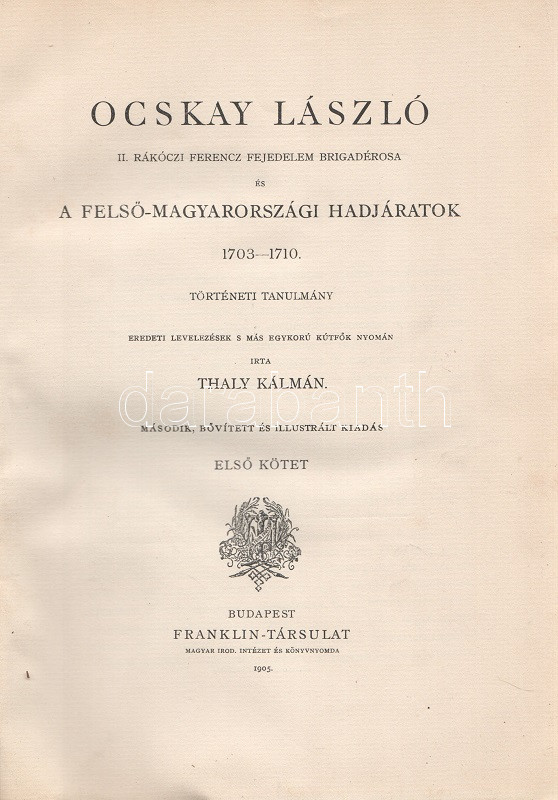 Thaly Kálmán: Ocskay László, II. Rákóczi Ferencz fejedelem brigadérosa és a felső-magyarországi hadjáratok 1703-1710. Történeti tanulmány. Eredeti levelezések s más egykorú kútfők nyomán írta Thaly Kálmán. I-II. kötet. [Teljes mű két kötetben.] Budapest, 1905. Franklin-Társulat Magyar Irodalmi Intézet és Könyvnyomda. 1 t. (címkép) + 400 + [2] p. + 30 t. (három dupla oldalas, ebből egy színes) + 7 melléklet (feliratozott hártyapapírral védett kihajtható hasonmások, ebből öt kétleveles); 1 t. (címkép) + 392 + [2] p. + 5 t. + 3 melléklet (feliratozott hártypapírral védett kétleveles hasonmások, ebből egy kihajtható) + 1 térkép (feliratozott hártyapapírral védett színes, kihajtható). Thaly Kálmán (1839-1909) író, költő, szerkesztő, országgyűlési képviselő, közhíresség. A függetlenségi szemléletű Thaly Kálmán, jóllehet történészi körökön kívül állt, a hazai Rákóczi-kutatás központi, megkerülhetetlen, közismert és kissé furcsállt, különc alakja. A markáns különvéleményéről ismert, egyáltalán nem rossz stiliszta Thaly Kálmán fordított plágiumáról híresült el (kuruc kori kutatásaiban eredeti kuruc költeményként tette közzé saját verseit), jelentős fantáziával megírt hadtörténeti írásai pedig emlékezetes bepillantást nyújtanak egy szenvedélyesen műkedvelő történész módszertanába és elbeszélésmódjába. Ocskay Lászlóról (1680-1710), a Rákóczi Ferencet szolgáló, majd császári zsoldba átálló brigadérosról írt életrajza kétségtelenül erős koncepcióval megírt, de később többször is hivatkozott, tisztességesen megírt filológiai munka. A mű első kiadása 1880-ban jelent meg, példányunk a munka második, bővített és illusztrált kiadásából: díszkiadásából való. Egységes, színes, illusztrált, enyhén sérült gerincű, enyhén foltos kiadói papírkötésben, az első kötet gerincén felül kisebb hiánnyal. Jó példány.