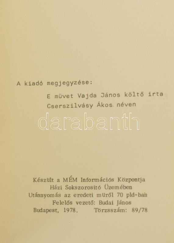 Cserszilvásy Ákos (Vajda János): A vadászat mestere. Önképző gyakorlat... https://www.darabanth.com/en/475-Online-auction/475.0/Books/Books-Hunting~1000023/Cserszilvasy-Akos-Vajda-Janos-A-vadaszat-mestere-Onkepzo-gyakorlati-utmutatas-a-vadasz~II3228501