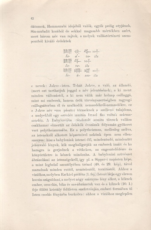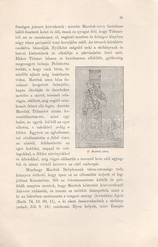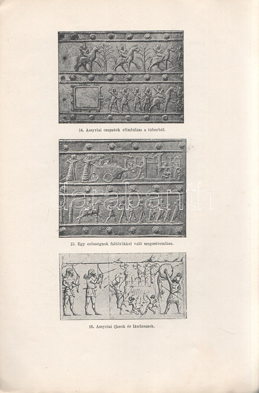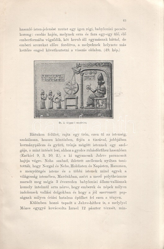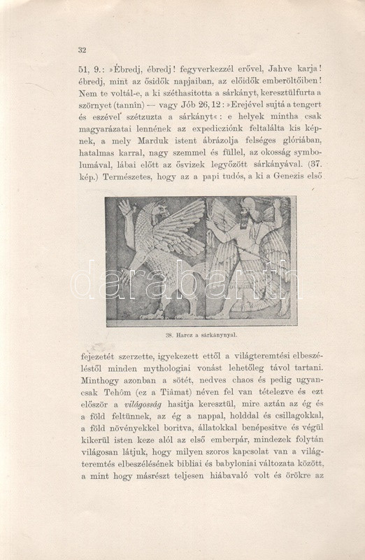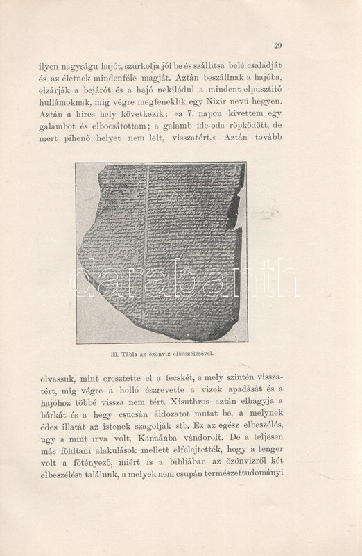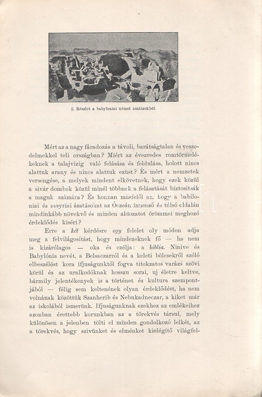 Delitzsch, [Friedrich] Frigyes: Babylonia és Biblia. Delitzsch Frigyes előadása. Az új és átnézett kiadás után. 49 képpel. Egyedül jogosított magyar fordítás. Budapest, 1903. Athenaeum Irodalmi és Nyomdai Rt. 44 p. Egyetlen magyar kiadás. Oldalszámozáson belül gazdag régészeti fotóanyaggal kísért orientalista tanulmány. Friedrich Delitzsch (1850-1922) német asszirológus előadásai először 1902 januárjában hangzottak el a német orientalista társaság, a Keleti Társaság ülésén, a századfordulón végzett mezopotámiai német ásatások leletanyagából levont következtetések nyomán. Delitzsch a császár személyes kérésére 1902 márciusában megismételte előadását a berlini királyi palota hallgatósága előtt. Delitzsch a leletanyag elemzése nyomán az ószövetségi zsidó kultúrát babiloni forrásból eredezteti, ami hangos vitát váltott ki a német közéletben, konzervatív zsidó és keresztény tudósok részéről. Az utolsó nyomtatott oldalon régi tulajdonosi bélyegzés. Fűzve, feliratozott, enyhén sérült kiadói borítóban.