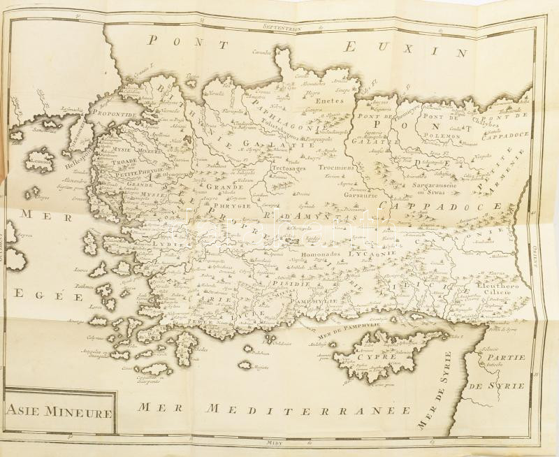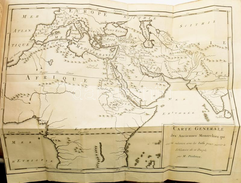 Prideaux, [Humphrey (1648-1724)]: Histoire des Juifs et des peuples voisins. Tome second. Depuis la décadence des Royaumes d'Israël & de Juda jusqu'á la mort de Jesus-Christ. Traduite de l'Anglois. Nouvelle édition. Amsterdam - Leipzig, 1755, Arkstee & Merkus, 1 (címkép) t. + 424 p.+2 (térképek) t. Francia nyelven. Korabeli félbőr-kötés, kopott, sérült borítóval, foltos lapokkal, a címlapon és egy lapon (1/2) kis sérüléssel, a két térképen kis szakadással.
