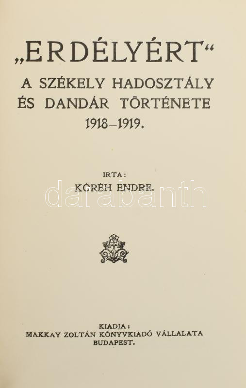 Koréh Endre: A székely hadosztály és dandár története. 1918-1919. I-II. köt. "Erdélyért." I-II. köt. [Egy kötetben.] Bp.,[1929], Makkay Zoltán, (Fáter és Társa-ny.), 241+1 p.; 230+1 p. Kiadói aranyozott félbőr sorozatkötésben, kopott, foltos borítóval, a gerincen kis sérülésekkel. A mű szerepel az 1945-1946-ban az Ideiglenes Nemzeti Kormány által betiltott, fasiszta és szovjetellenes könyvek listáján.