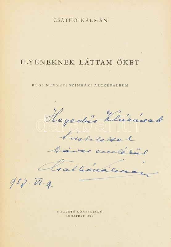 Csathó Kálmán: Ilyeneknek láttam őket. I-II. köt. I. köt.: Ilyeneknek láttam őket. Régi Nemzeti Színház arcképalbum.; II. köt.: A régi Nemzeti Színház. Ilyeneknek láttam őket. Régi Nemzeti Színház arcképalbum II. kötete. Bp., 1957-1960, Magvető. Kiadói félvászon-kötések, kissé kopott borítókkal. A szerző, Csathó Kálmán (1881-1964) író, színházi rendező, színházigazgató által DEDIKÁLT példány!