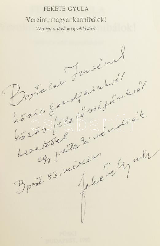 Fekete Gyula: Vérem, magyar kannibálok. Vádirat a jövő megrablásáról. 348p. Bp., 1992. Püski. Kiadói papírkötésben DEDIKÁLT