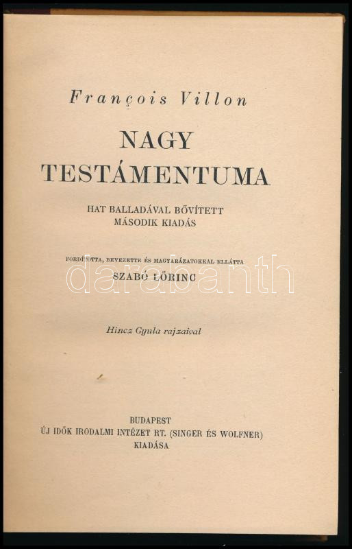 Description: Francois Villon Nagy Testámentuma. Hat balladával bővített második kiadás. Ford., bevezette és magyarázatokkal ellátta: Szabó Lőrinc. Hincz Gyula rajzaival. Bp., 1944, Új Idők (Singer és Wolfner), 172 p. Szövegközti és egészoldalas illusztrációkkal. Kiadói félvászon-kötés.