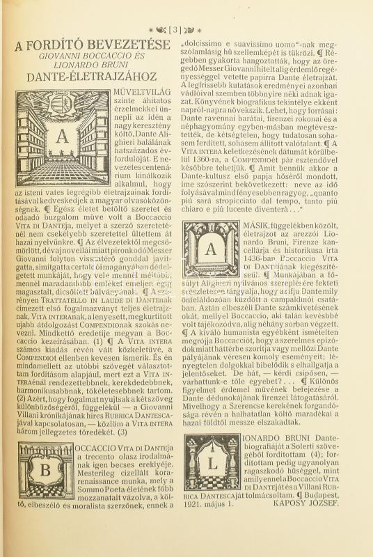 Description: Giovanni Bocaccio: Trattatello in laude di Dante, azaz Dante dicsérete. Dante Alighieri első olasz életrajza. Ford., bevezetéssel és jegyzetekkel ellátta: Kaposy József. Monumenta Literarum I. sorozat 4. sz. Gyoma, 1921, Kner Izidor, 34+(2) p. Kozma Lajos fametszetű könyvdíszeivel. Átkötött egészvászon-kötésben, az eredeti (ázott) papírborító felhasználásával. Megjelent 600 példányban.