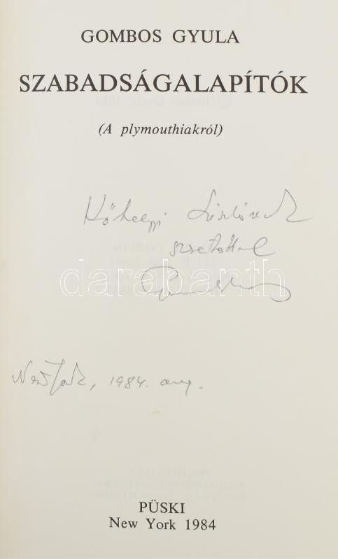 Gombos Gyula: Szabadságalapítók. (A plymouthiakról.) New York, 1984, P... https://www.darabanth.com/en/475-Online-auction/475.0/Books/Books-Other-rarities~1000037/Gombos-Gyula-Szabadsagalapitok-A-plymouthiakrol-New-York-1984-Puski-Emigrans-kiadas-~II3228431