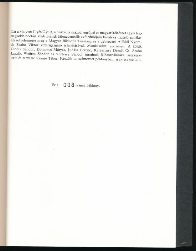 Illyés Gyula 90. A költő születésének 90. évfordulójára. Szerk. és tervezte: Szántó Tibor. Illyés Gyula, Csoóri Sándor, Domokos Mátyás, Juhász Ferenc, Keresztury Dezső, Cs. Szabó László, Weöres Sándor, és Vértessy Sándor írásaival. Bp.-Debrecen, 1992., Magyar Bibliofil Társaság-Alföldi Nyomda. Kiadói papírkötés. Számozott (8./500) példány.