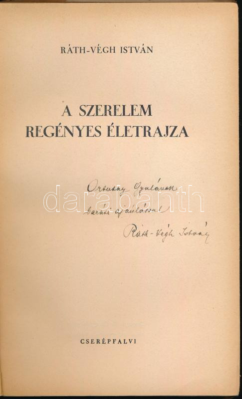 Ráth-Végh István: A szerelem regényes életrajza. A szerző, Ráth-Végh István (1870-1959) író, művelődéstörténész, jogász, táblabíró, ügyvéd által Ortutay Gyula (1910-1978) néprajztudós, későbbi politikus, miniszter részére DEDIKÁLT példány! Bp., 1941., Cserépfalvi,(Pápai Ernő-ny.), 250+4 p. Első kiadás! Kiadói papírkötés, hiányos, sérült borítékkal.