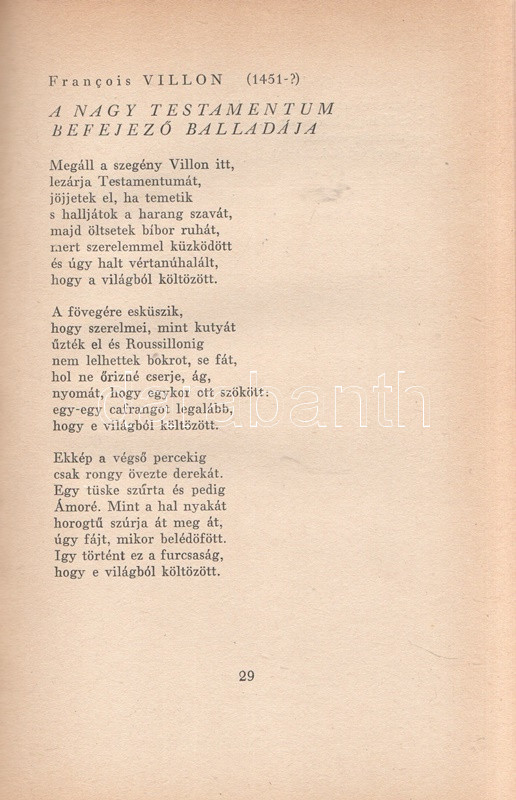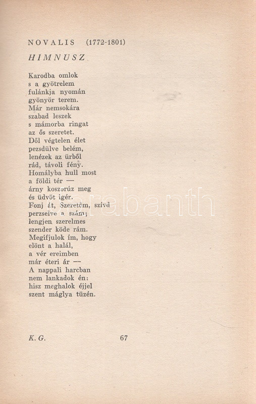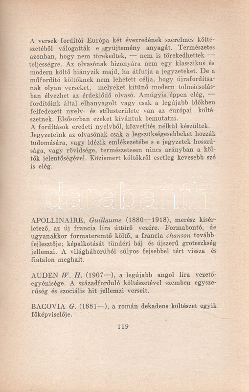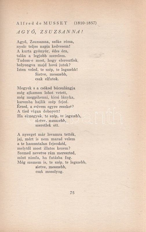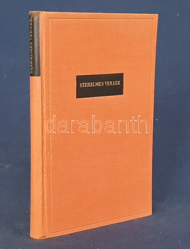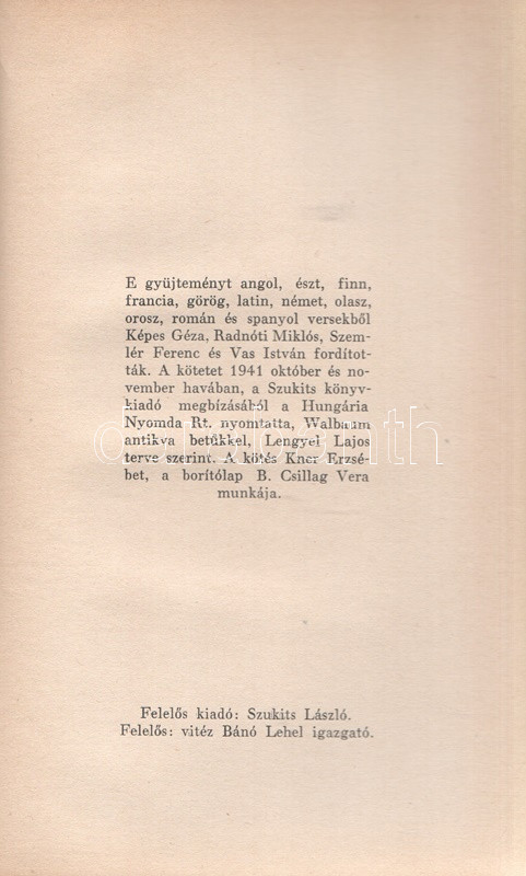 Szerelmes versek. Világirodalmi antológia két évezred költészetébÅ‘l. Képes Géza, Radnóti Miklós, Szemlér Ferenc, Vas István műfordÃtásai. Budapest, (1941). Szukits Könyvkiadó (Hungária Nyomda Rt.) 139 + [3] p. Egyetlen kiadás. Kolofon: ,,E gyűjteményt angol, észt, finn, francia, görög, latin, német, olasz, orosz, román és spanyol versekbÅ‘l Képes Géza, Radnóti Miklós, Szemlér Ferenc és Vas István fordÃtották. A kötete 1941 október és november havában, a Szukits könyvkiadó megbÃzásából a Hungária Nyomda Rt. nyomtatta, Lengyel Lajos terve szerint. A kötés Kner Erzsébet, a borÃtólap B. Csillag Vera munkája". Az elsÅ‘ elÅ‘zéken régi kereskedÅ‘i könyvjegy, régi ajándékozási bejegyzés és tulajdonosi bélyegzés. Aranyozott, vaknyomásos kiadói egészvászon kötésben, felül vörös festésű lapszélekkel. Jó példány.
