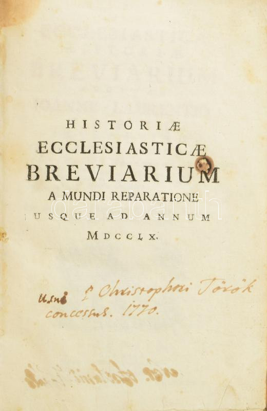 [Berti, Giovanni Lorenzo (1696-1766)]: Ecclesiasticae historiae breviarium auctore Joanne-Laurentio Berti Florentino fratre eremita Augustiniano. Editio Novissima. Pars Prima. Venetiis, 1763, Ex Typographia Remondiniana, XVI+260 p. Latin nyelven. Pergamen-kötésben, viseltes állapotban, koszos, foltos borítóval, kissé foltos lapokkal, az előzéklapon és a címlapon égetett lyukakkal, néhány korabeli bejegyzéssel (az egyik névbejegyzés: P. Christophori Török, 1770).