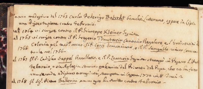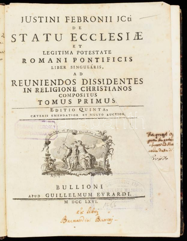 [Hontheim, Johann Nikolaus von (1701-1790)] Justini Febronii JCti De statu ecclesiae et legitima potestate Romani Pontificis liber singularis, ad reuniendos dissidentes [...] I-II. köt. [Egy kötetben]. Bullioni, 1766, Apud Guillelmum Evrardi. Latin nyelven. Aranyozott gerincű félbőr-kötésben, kissé sérült, kopottas borítóval, helyenként foltos lapokkal, korabeli bejegyzésekkel, "Dr. Hanuy Ferenc könyvadománya" bélyegzőkkel.