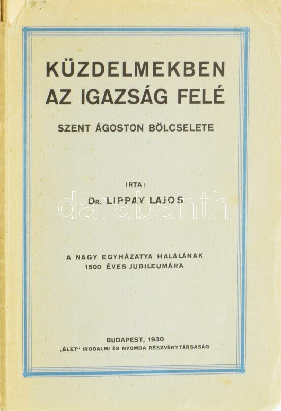 Lippay Lajos: Küzdelmekben az igazság felé. Szent Ágoston bölcselete. (Dedikált!) Bp., 1930, ,,Élet" Irodalmi és Nyomda Rt., 198+(2) p. Első kiadás. Kiadói papírkötés, kissé sérült borítóval, néhány a fűzéstől részben elváló lappal. A szerző, Lippay Lajos (1897-1949) római katolikus pap, kanonok, teológiai doktor, egyházi író által dedikált példány.