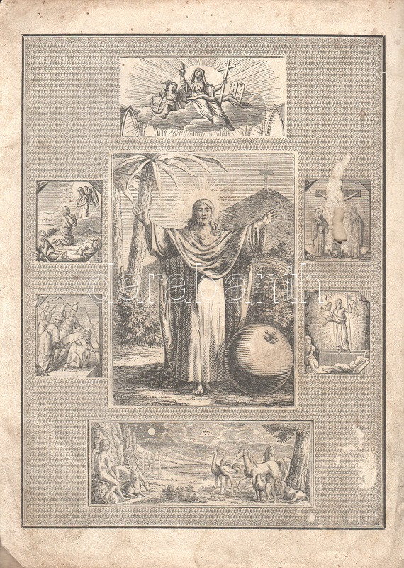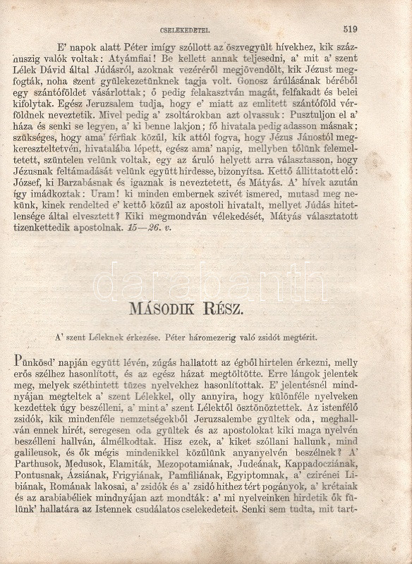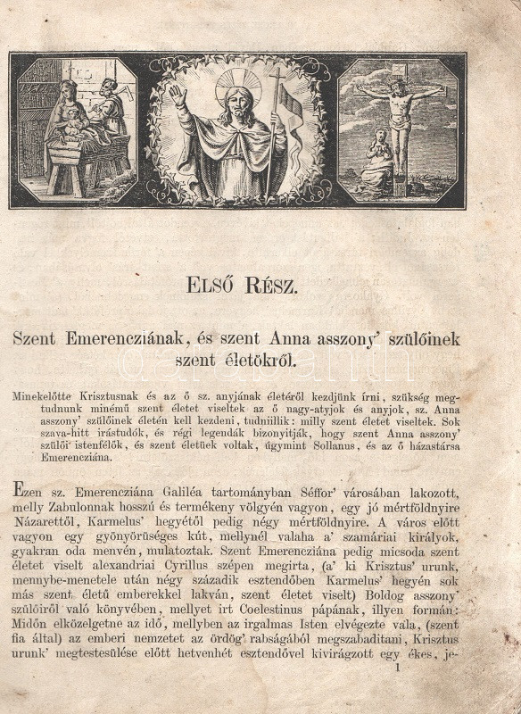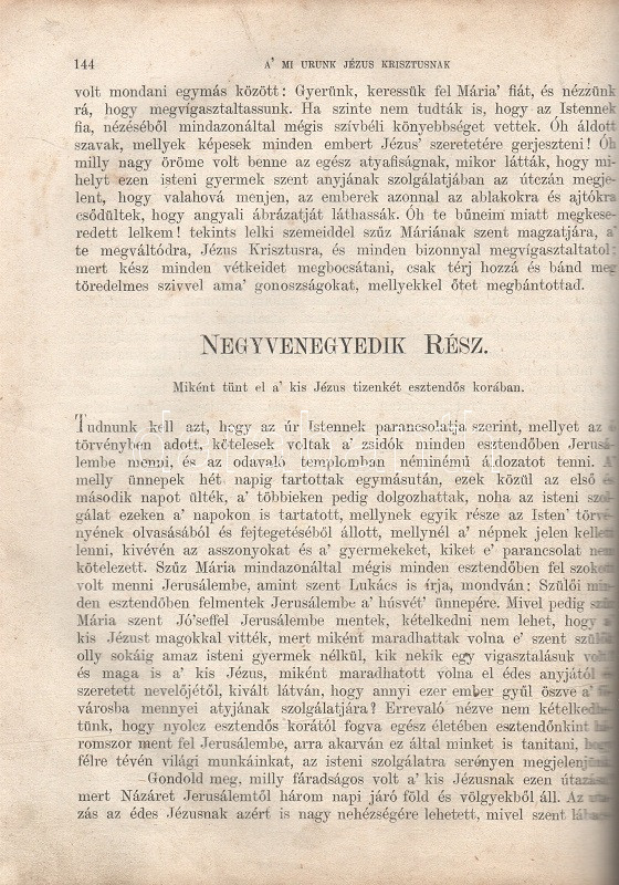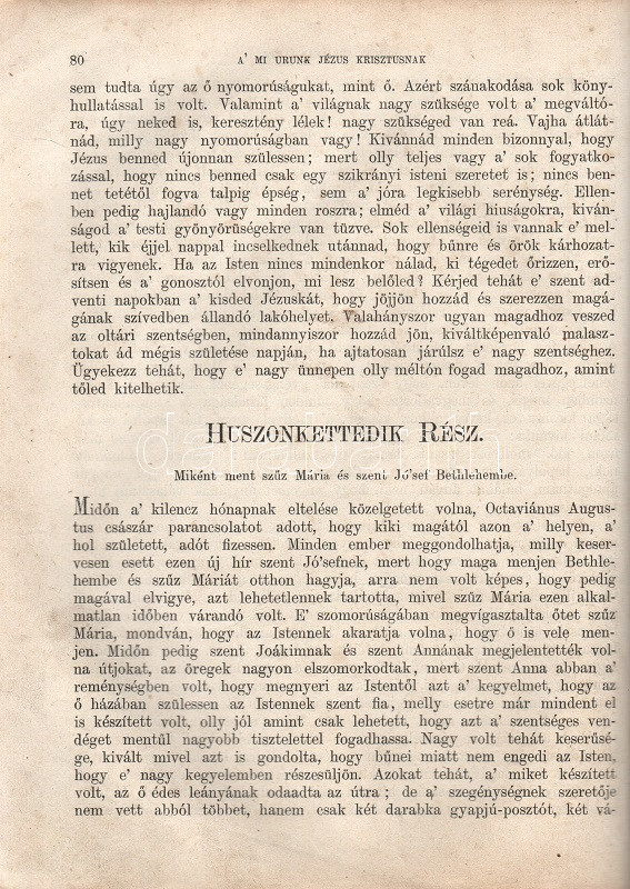 Makula-nélkül-való Tükör, melly az Üdvözítő Jézus Krisztusnak és szent szülőjének életét, keserves kínszenvedését és halálát adja elő. Budán, 1872. Nyomatott a Magyar Királyi Egyetemi Nyomdában. [4] + 560 + [6] p. A három jól elkülönülő részből álló katolikus imádságoskönyv Szűz Mária és Jézus élete, illetve az Apostolok cselekedetei nyomán írt kegyes elmélkedéseket tartalmaz. A barokk kor híres meditációs népkönyvét cseh nyelvből Újfalusi Judit nagyszombati klarissza fejedelemasszony fordította, magyarul először 1712-ben jelent meg. Példányunk az imádságoskönyv tizedik kiadásából való. A címlap előtt egész oldalas, fametszetű címkép, rektóján magyar nyelvű jegyzet, az első előzéken régi, magyar nyelvű családi bejegyzések. A halványan foltos címoldalon apró, a szövegtükröt nem érintő hiány. Kötetünk első harmada lapjain halvány foltosság. Példányunk repülő előzékei, valamint a tartalomjegyzék utolsó két levele hiányoznak. Aranyozott, enyhén sérült gerincű korabeli félbőr kötésben, az enyhén kopott kötéstáblákon apró hiány.
