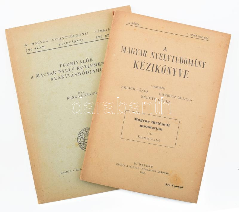 Klemm Antal: Magyar történeti mondattan. A magyar nyelvtudomány kézikönyve. II. köt. 6. füzet. Szerk.: Melich János, Gombocz Zoltán, Németh Gyula. Bp., 1928. MTA (Hornyánszky ny.). 219 p Kiadói papírkötésben. + Benkő Loránd: Tudnivalók a magyar nyelv közleményeinek alakításmódjához. Magyar Nyelvtudományi Társaság 129. sz. Bp., 1972, Magyar Nyelvtudományi Társaság, 2+62 p. Kiadói papírkötés. Megjelent 400 példányban.