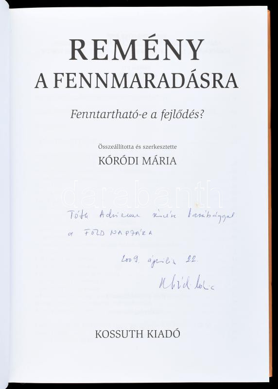 Description: Kóródi Mária: Remény a fennmaradásra. Fenntartható-e a fejlődés? Összeáll. és szerk.: - - . (Dedikált!) Bp., 2007, Kossuth. Kiadói kartonált papírkötés. Kóródi Mária (1950- ) jogász, politikus, környezetvédelmi miniszter (2002-2003) által dedikált példány.