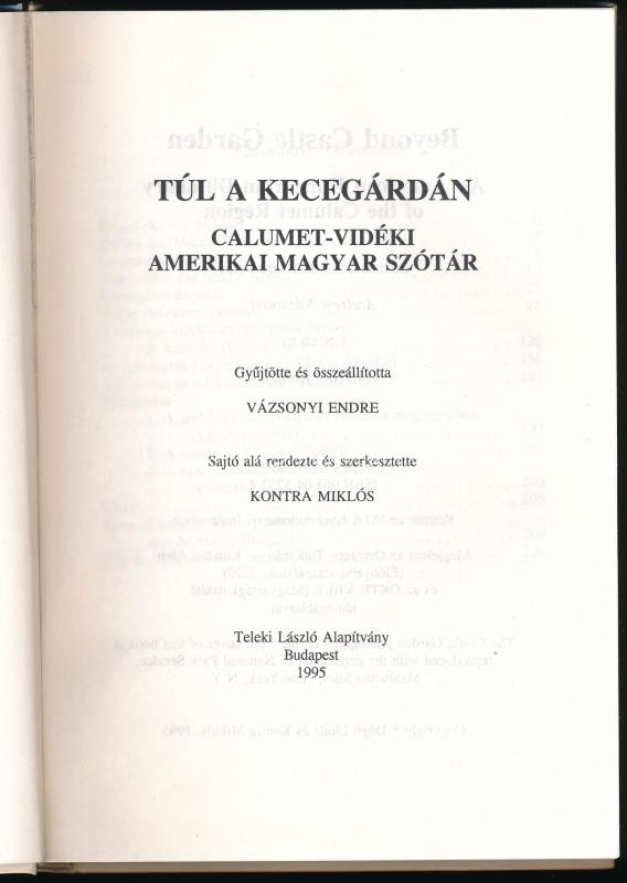 Description: Vázsonyi Endre - Kontra Miklós: Túl a Kecegárdán. Calumet-vidéki amerikai magyar szótár. A Magyarságkutatás könyvtára XV. Bp., 1995, Teleki László Alapítvány. Kiadói kartonált papírkötés.