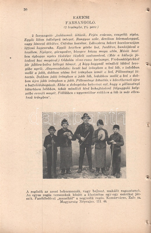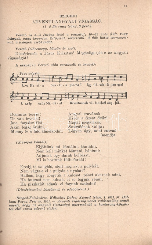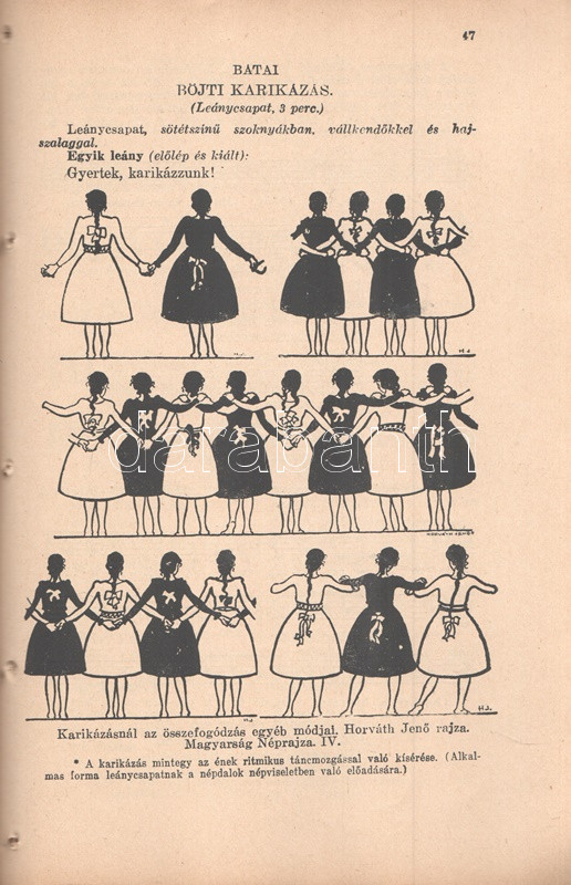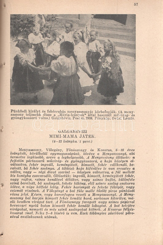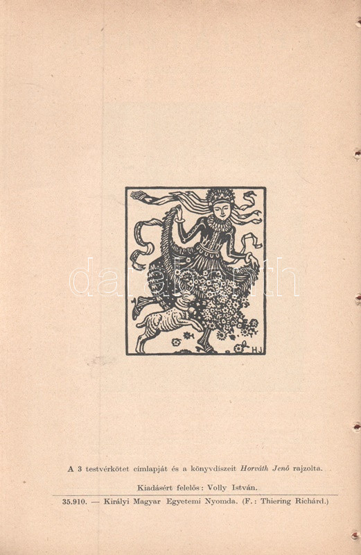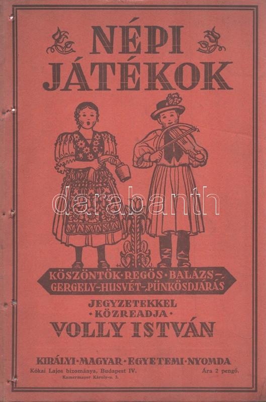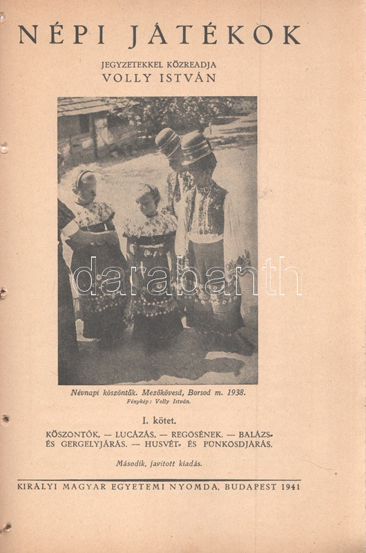Volly István: Népi játékok. Jegyzetekkel közreadja Volly István. I. kötet: Köszöntők - Lucázás - Regösének - Balázs- és Gergely-járás - Húsvét- és pünkösdjárás. Budapest, 1941. (Szerző) Királyi Magyar Egyetemi Nyomda. 68 p. Volly István (1907-1992) népdalgyűjtő, folklorista, zeneszerző, karvezető az 1920-as évek végétől foglalkozott népdalgyűjtéssel, népi játékok gyűjtésével. A gyűjtött karácsonyi népszokások alapján már 1934-től önálló esteket rendezett a Magyar Állami Operaházban, 1938-tól pedig füzetsorozat formájában tette közzé népi gyűjtése egy részét. Oldalszámozáson belül gazdag fotóanyaggal és Horváth Jenő könyvdíszeivel megjelent füzete a munka második, javított kiadásából származik. Fűzve, Horváth Jenő grafikusművész által illusztrált kiadói borítóban. Jó példány.