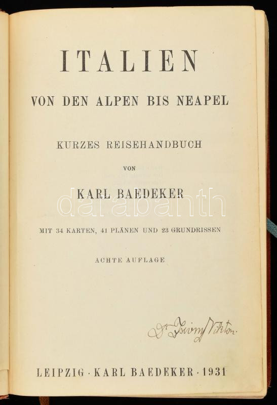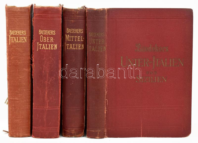 4 db Baedeker útikönyv (Olaszország): Karl Baedeker: Mittelitalien und Rom.; Oberitalien mit Ravenna, Florenz und Pisa.; Italien von den Alpen bis Neapel.; Unteritalien, Sizilien. Sardinien, Malta, Tripolis, Korfu. Hanbuch für Reisende. Leipzig, 1927-1936, Karl Baedeker. Számos térképpel illusztrálva. Német nyelven. Kiadói aranyozott egészvászon-kötés, vegyes állapotban, a gerinceken sérülésekkel.