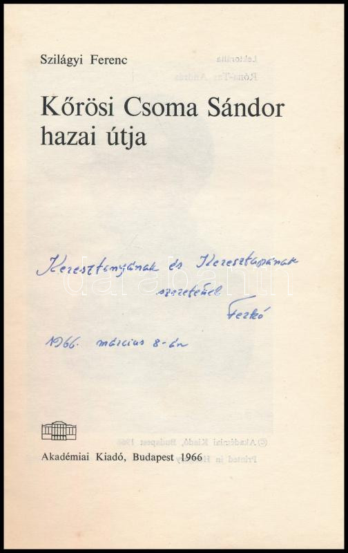 Szilágyi Ferenc: Kőrösi Csoma Sándor hazai útja. DEDIKÁLT! Bp., 1966, Akadémiai. Kiadói papírkötés, sérült papír védőborítóval, viseltes állapotban.