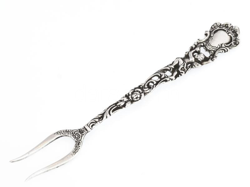 Ezüst(Ag) barokkos nyelű puttós sajtvilla, jelzett, h: 14,2 cm, nettó: 16,8 g