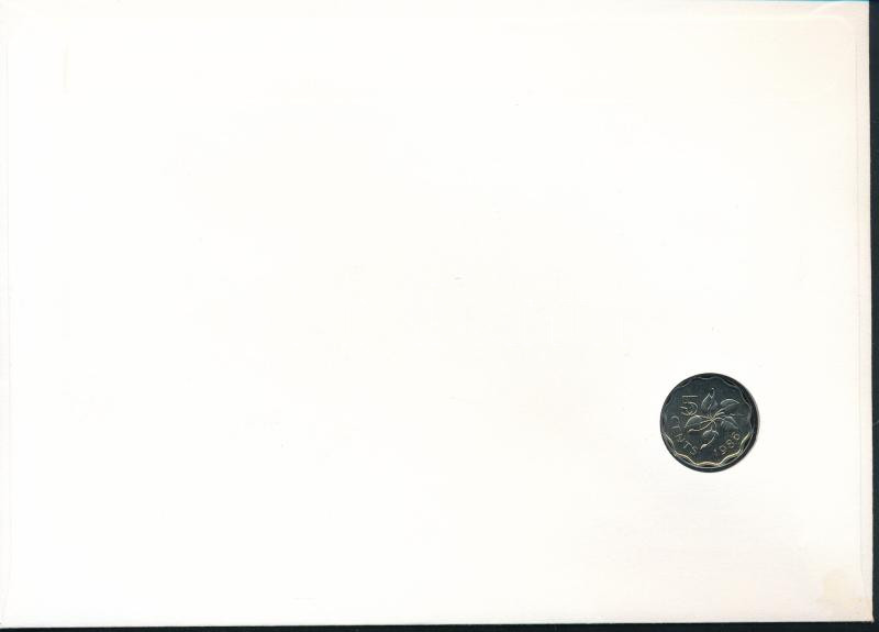 Swaziland 1986. 5 Cents Cu-Ni in envelope with stamp, cancellation, and a description in german C:UNC