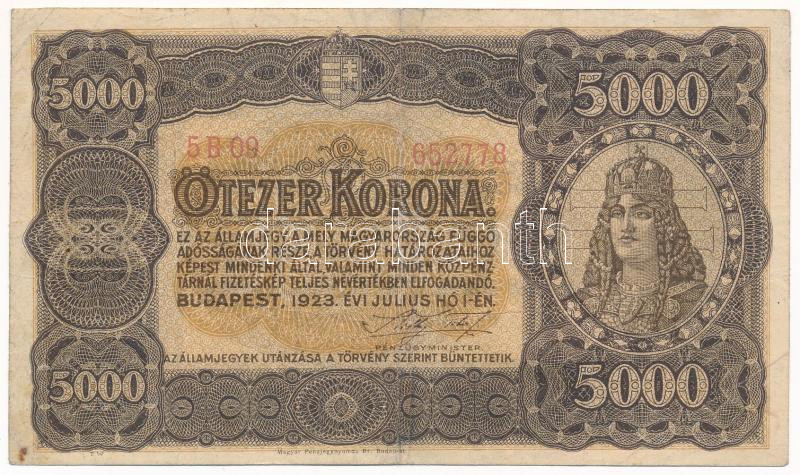 1923. 5000K piros "5 B09 652778" sorszámmal "Magyar Pénzjegynyomda Rt. Budapest" nyomdahely jelöléssel T:F