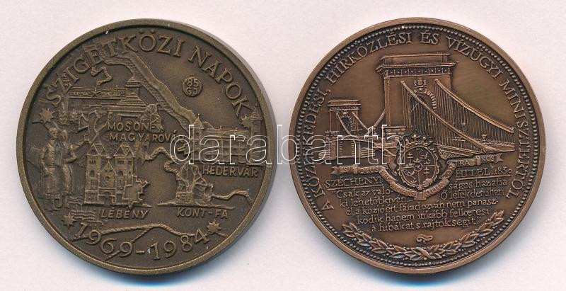 Description: Garamkeszi János (1936-) 1985. "10 éves a MÉE Mosonmagyaróvári Csoportja / Szigetközi Napok" bronz emlékérem (42,5mm) + Bozó Gyula (1913-2004) 1991. "Széchenyi István születésének 200. évfordulója / A Közlekedési, Hírközlési és Vízügyi Minisztertől" kétoldalas bronz emlékérem (42,5mm) T:AU