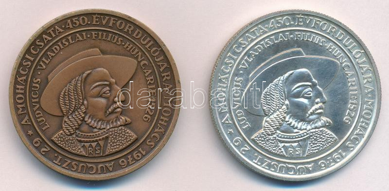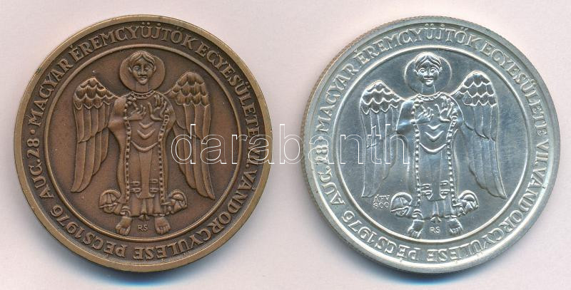 Description: Rétfalvi Sándor (1941-2021) 1976. "MÉE VII. Vándorgyűlése Pécs 1976 / A mohácsi csata 450. évfordulójára" Ag és bronz emlékérem pár (25,01g/0.800/42,5mm) T:UNC