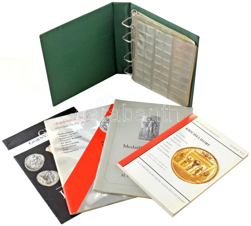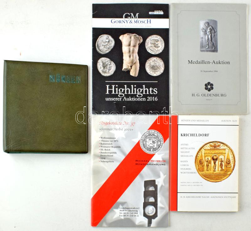 Vegyes 4db-os árverési katalógus és kellék tétel, benne: Kricheldorf 1994. októberi 46. árverési katalógusa, H.G. Oldenburg 1994. szeptemberi 30. árverési katalógusa, Michael Heinrich Münzhandlug 2001. nyári-őszi 37. árverési katalógusa, Gorny & Mosch 2016-os árverési anyagainak kiemelkedő tételeit összefoglaló füzet + "MÜNZEN" feliratú, kisalakú négygyűrűs berakó 7db berakólappal