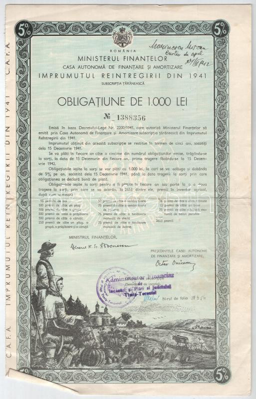 Románia 1941. "Romania Ministerul Finantelor" a Román Pénzügyminisztérium 5%-os kölcsön kötvénye 1000L-ről T:F