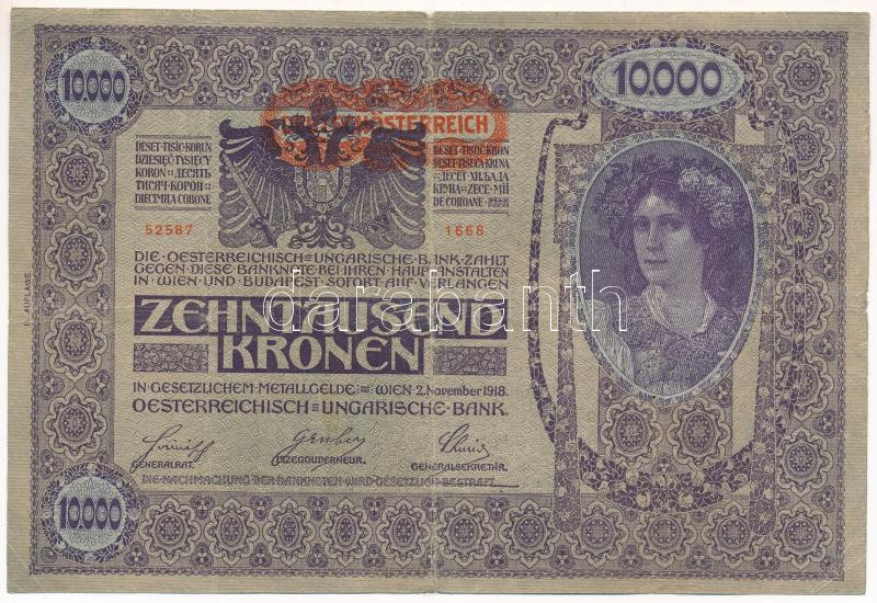 Ausztria 1918. 10.000K vízszintes "DEUTSCHÖSTERREICH" felülb... https://www.darabanth.com/en/475-Online-auction/475.0/Numismatics/Worldwide-banknotes~2000016/Ausztria-1918-10000K-vizszintes-DEUTSCHOSTERREICH-felulbelyegzessel-TF-kis-szakadasok-Au~II3227125