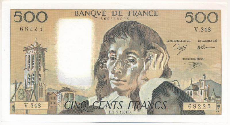 https://www.darabanth.com/en/475-Online-auction/475.0/Numismatics/Worldwide-banknotes~2000016/Franciaorszag-1991-majus-2-500Fr-V348-68225-TXF-France-1991-May-2nd-500-Francs-V348-68225~II3225278