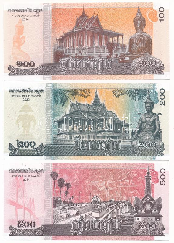 Kambodzsa 2014. 100R + 2022. 200R + 2014. 500R T:UNC