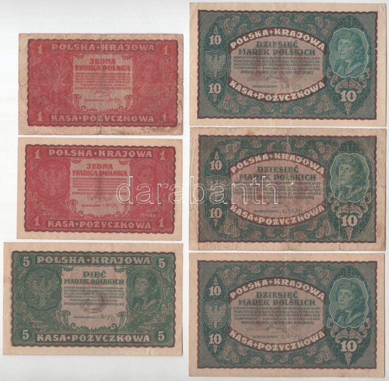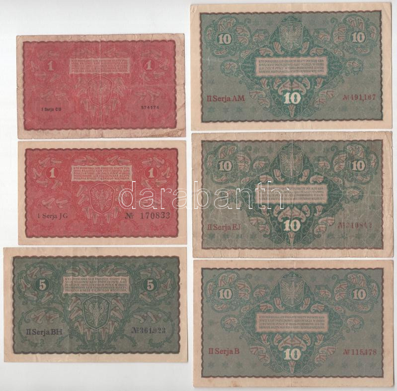 https://www.darabanth.com/en/475-Online-auction/475.0/Numismatics/Worldwide-banknotes~2000016/Lengyelorszag-1919-1M-10M-6xklf-TF-VG-Poland-1919-1-Marka-10-Marka-6xdiff-CF-VG~II3203164