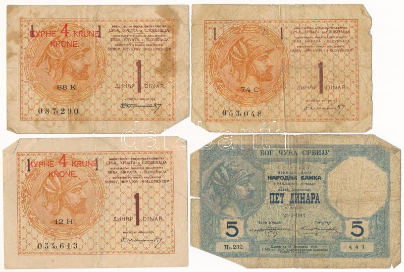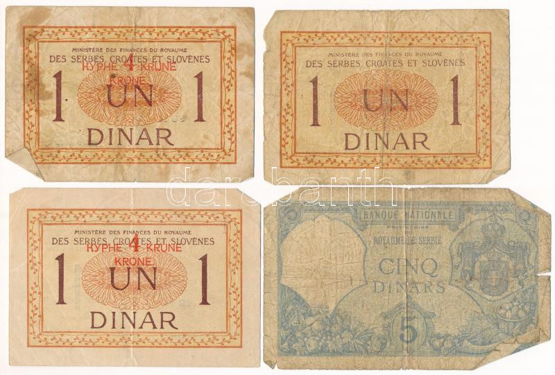 Description: Szerbia 1917. 5D + Szerb-Horvát-Szlovén Királyság 1919. 1D (3x), közte 2db piros "4K" felülbélyegzéssel T:VG szakadás Serbia 1917. 5 Dinara + Kingdom of the Serbs, Croats and Slovenes 1919. 1 Dinar (3x), 2pcs with red "4 Kronen" overprint C:VG tears